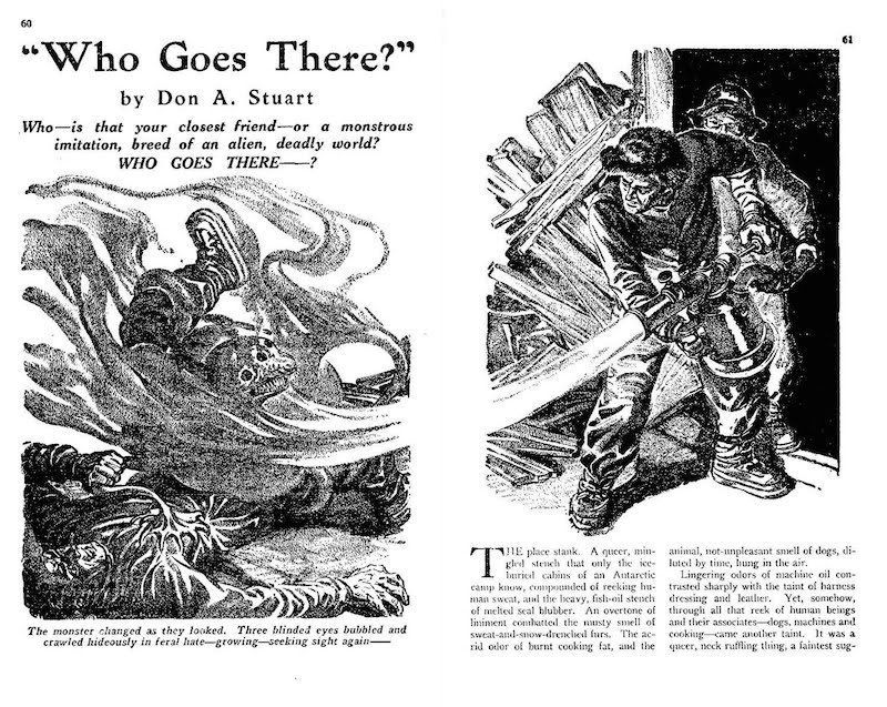 However, there are exceptions that can be intelligent, compelling, and thought-provoking, among them John Carpenter’s masterful remake of The Thing from Another World, made some thirty years later as simply The Thing. But first I want to talk a little about the story that inspired both adaptations, John W. Campbell Jr.’s 1938 novella Who Goes There? (written under the pen name Don A. Stuart).